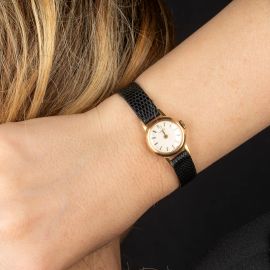 cassa in oro giallo 18kt, fondello a pressione, quadrante argentè, indici applicati, movimento a carica manuale cal 14.162, cinturino in pelle nere con fibbia in metallo non marcati, vetro plastica, gr. 8. Diam. mm 19