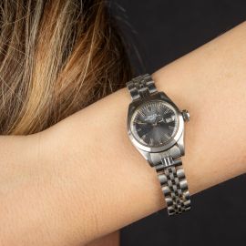 cassa in acciaio, fondello serrato a vite, lunetta liscia, corona marcata, quadrante Sigma grigio con indici applicati al trizio, grafica nera, datario a ore tre con lente cyclope, movimento a carica automatica cal 2030, bracciale jubilee in acciaio ref. 6152D finali 89, lungh. interna cm 18, chiusura a scatoletta marcata Rolex, vetro plastica. Diam. mm 25.