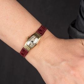 cassa tonneau in oro giallo 18kt, fondello pressione recante dedica a data, lunetta e anse a scalini, quadrante argenté ristampato, grafica nera, numeri arabi applicati, movimento a carica manuale, cinturino in pelle bordeaux con fibbia in metallo non originali, vetro plastica, gr. 13. Dim. mm 15x30. Corredato di astuccio e garanzia del rivenditore.