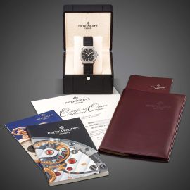 cassa monoblocco in acciaio, fondello a pressione con pellicola, corona marcata, ghiera liscia in acciaio, quadrante "Grand Tapisserie" di colore nero "army", grafica bianca, numeri arabi e indici applicati al superluminova, datario a ore tre, movimento a carica automatica cal 330SC n. 3024080, cinturino in gomma nera, lungh. interna cm 21, chiusura doppia deployant marcata Patek Philippe, vetro minerale. Diam. mm 35. Corredato di scatola, garanzia e astuccio del service.