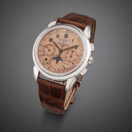 cassa in platino, fondello con movimento a vista, corona marcata, tasti del crono rettangolari, quadrante salmone, grafica nera, numeri arabi applicati, due contatori, scala tachimetrica, datario a doppia finestra a ore dodici, datario tra le quattro e le cinque, calendario perpetuo, fasi lunari, movimento a carica manuale cal CH 29-535 PS Q n. 7206308, cinturino originale in pelle marrone, fibbia deployant in platino marcata Patek Philippe, vetro minerale, gr. 134. Diam. mm 41
