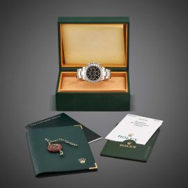cassa in acciaio, fondello serrato a vite, corona marcata e pulsanti a vite, ghiera in acciaio con scala tachimetrica a 400, quadrante nero, grafica bianca, indici applicati al superluminova, tre contatori, secondi a ore sei, movimento a carica automatica cal 4130, bracciale oyster a maglie piene satinate e lucide in acciaio cod. produzione CL9, lungh. interna cm 19, chiusura a scatoletta in acciaio marcata Rolex, vetro minerale. Diam. mm 40. Corredato di scatola, controscatola, garanzia e una maglia aggiuntiva.