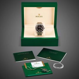 cassa in acciaio, fondello serrato a vite, corona marcata, valvola elio sul lato sinistro, ghiera in acciaio con inserto in ceramica nera, quadrante nero con scritta rossa, grafica bianca, bicchierini al superluminova, datario a ore tre con lente cyclope, movimento a carica automatica, bracciale oyster a maglie piene in acciaio, cod. produzione A0W, lungh. interna cm 20, chiusura a scatoletta in acciaio marcata Rolex, vetro minerale. Diam. mm 43. Corredato di scatola, controscatola, garanzia e due maglie aggiuntive.