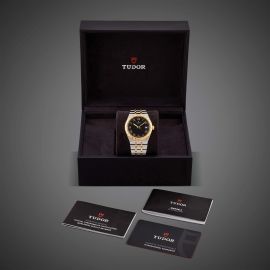 cassa in acciaio, fondello serrato a vite, corona marcata, ghiera zigrinata in oro giallo, quadrante blu, grafica oro, numeri romani applicati, lancette al superluminova, datario a ore tre, movimento carica automatica cal 2429, bracciale a maglie in acciaio e oro ref. 91053, chiusura deployant in acciaio marcata Tudor, vetro minerale, gr. 134. Diam. mm 38.