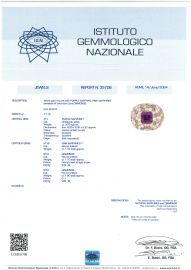 in oro bianco 18kt, impreziosito al centro da uno zaffiro viola taglio ottagonale di ct 3.20 circa, circondato da zaffiri rosa taglio rotondo per ct 1.10 circa, diamanti taglio brillante per ct 1.80 circa e diamanti fancy taglio brillante per ct 1.10 circa, mis. 13/53, gr. 11. Corredato di certificato IGN del 14/06/2024 attestante le caratteristiche e l'assenza di trattamenti termici sullo zaffiro viola.