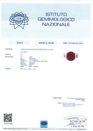 in oro giallo e bianco 18kt, impreziosito al centro da un rubino thailandese taglio ovale di ct 5.70 circa, affiancato da due diamanti taglio fantasia per ct 1.90 circa, punzoni 750 e del fabbricante, mis. 14/54, gr. 5. Corredato di certificato IGN del 18/09/2024 attestante le caratteristiche e l'origine del rubino.