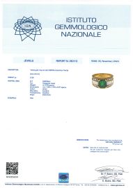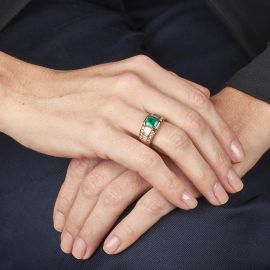 in oro giallo 18kt, impreziosito da uno smeraldo colombiano centrale di ct 2 circa, affiancato da diamanti taglio baguette e brillante per ct 1.30 circa, punzone 750, mis. 13/53, gr. 9. Corredato di certificato IGN del 05/11/2024 attestante le caratteristiche e l'origine geografica dello smeraldo.