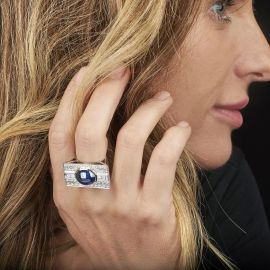 in oro bianco 18kt, impreziosito al centro da uno zaffiro taglio cabochon di ct 9 circa, circondato da pavé di diamanti taglio brillate e carré per ct 1.70 circa, punzoni 750 e del fabbricante, mis. 14/54, gr. 19