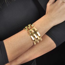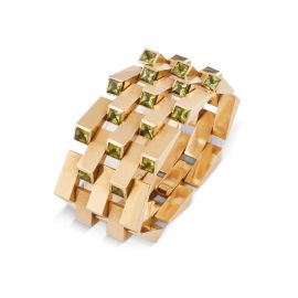 in oro giallo 18kt, realizzato ad ampia fascia con una serie concatenata di maglie geometriche impreziosite da peridot taglio fantasia, lungh. cm 18, gr. 137
