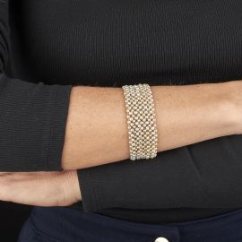 in platino, realizzato a maglia tessita con piccole perle di mm 3 circa, fermatura impreziosita da rose di diamante, lungh. cm 18, gr. 22