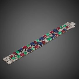 in oro bianco 18kt, realizzato a fascia, con foglie di zaffiri, rubini e smeraldi intagliati, impreziosito da diamanti taglio brillante per ct 2.50 circa, punzone 750, lungh. cm 18, gr. 73