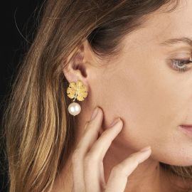 in oro giallo e bianco satinato 18kt, realizzati a forma di foglia, impreziositi al centro da diamanti taglio huit huit, con due perle pendenti south sea di mm 12 circa applicate successivamente, firmati "Federico Buccellati", chiusura a clip con perno, punzone 750, dim. cm 2x3,5, gr. 12 complessivi