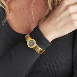cassa in oro giallo 18kt, fondello a pressione, lunetta con incisione Bulgari Bulgari, quadrante nero, grafica oro, indici e numeri arabi stampati, movimento al quarzo, bracciale tubogas a molla in oro giallo 18kt firmato Bulgari, vetro minerale, gr. 75. Diam. mm 23.