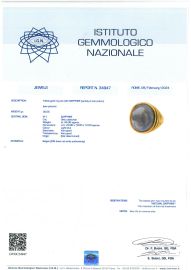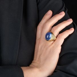 in oro giallo 18kt, fascia con scanalature volta a racchiudere uno zaffiro taglio cabochon di ct 45 circa, firmato "Bulgari", mis. 12/52, gr. 35. Corredato di certificato IGN del 09/02/2024 attestante le caratteristiche e l'assenza di trattamenti termici.