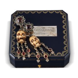 in oro e argento, impreziositi da pietre di colore e rose di diamante, con due teschi in osso intagliato (difetti), firmati "A.Codognato", chiusura a clip con perno, lungh. cm 9, gr. 49 complessivi. Corredato di certificato di autenticità del 18/06/2014.
