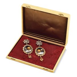 in oro e argento, con due elementi ovali smaltati su un lato, raffiguranti due teschi e con scena figurata sul retro, impreziositi da diamanti taglio brillante, da cui pendono due quarzi citrini taglio a goccia cinti da serpenti, firmati "A.Codognato", punzone 750, chiusura a clip con perno, gr. 86 complessivi. Corredati di scatola e di certificato di autenticità del 10/06/2015.
