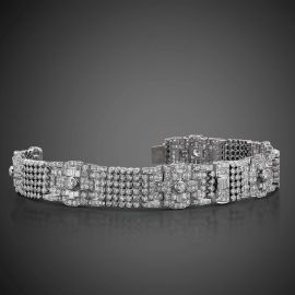 in platino e oro bianco 18kt, composti da una serie di maglie geometriche, ciascuno impreziosito da diamanti taglio vecchio, brillante e baguette per ct 14 circa l'uno, convertibile in collier de chien, punzone 950, 750 e marchio "JC", lungh. bracciali cm 16, lungh. collana cm 32, gr. 143 complessivi