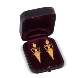 in oro giallo 18kt, realizzati a forma di anfora con lavorazione in filigrana, lungh. cm 4, gr. 7 complessivi