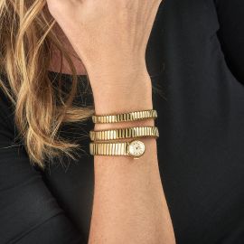 cassa in oro giallo 18kt, quadrante bianco firmato "Ebel" con indici applicati, diam. mm 13, movimento a carica manuale, bracciale tubogas integrato in oro giallo 18kt, punzone 750, circonferenza interna cm 15,5 circa, gr. 89