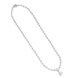 in oro bianco 18kt, impreziosito da una fila di diamanti taglio brillante (uno mancante) per ct 5 circa, al centro un diamante taglio brillante di ct 0.80 circa, e un diamante pendente taglio brillante di ct 1.20 circa, punzone 750, lungh. cm 40,5, gr. 13