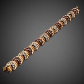 in oro giallo 18kt, composto da una serie di maglie a ventaglio con scanalature, impreziosito da rubini taglio rotondo per ct 2.20 circa e diamanti taglio brillante per ct 2.80 circa, punzone del fascio e del fabbricante, lungh. cm 18, gr. 47