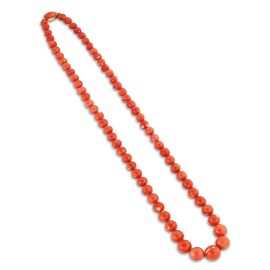 realizzata ad un filo di boules in corallo digradanti di mm 17-9 circa, fermatura in oro giallo 18kt, lungh. cm 87, gr. 162