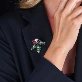 in oro giallo 18kt e platino, composta da spilla e paio di orecchini, impreziositi da rubini, zaffiri, smeraldi taglio rotondo per ct 10 circa e diamanti taglio brillante per ct 3.40 circa, firmati "Mauboussin", punzoni francesi dell'oro e del platino, marchi 750 e PT950, dim. spilla cm 4x4 circa, dim. orecchini cm 2x2,5 circa, chiusura a clip, gr. 35 complessivi