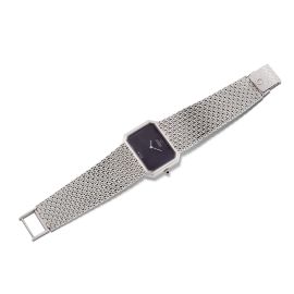 cassa di forma in oro bianco 18kt, fondello a pressione, corona con pietra cabochon blu, quadrante nero (difetti), grafica argento, movimento a carica automatica cal 671, bracciale integrato a maglia tessita in oro bianco 18kt con chiusura a scomparsa in oro bianco marcata Omega, vetro minerale, gr. 96. Dim. mm 34x23. Corredato di scatola.