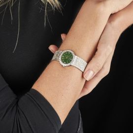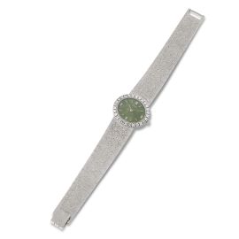 cassa di forma ovale in oro bianco 18kt, fondello serrato con viti, lunetta impreziosita da una fila di diamanti, quadrante in nefrite, grafica argento, numeri romani stampati, movimento a carica manuale, bracciale integrato in oro bianco 18kt a corteccia d'albero, lungh. cm 19, con chiusura a scomparsa marcata Piaget, vetro minerale, gr. 66. Dim. mm 27x24