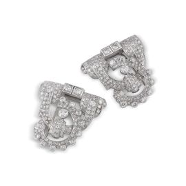 in platino, impreziosita da diamanti taglio vecchio e a rosa (due mancanti) per ct 6 circa, scomponibile in due clips, dim. cm 6,5x3,5, gr. 33