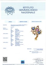 in oro giallo 18kt, impreziosita da uno zaffiro taglio cuscino di ct 3.60 circa, uno zaffiro rosa taglio ottagonale di ct 2.50 circa, uno zaffiro taglio cuscino di ct 4.20 circa e uno zaffiro padparadscha taglio ottagonale di ct 2.70 circa, circondata da diamanti taglio brillante per ct 2.40 circa, dim. cm 4x5,5, gr. 19. Corredata di certificato IGN del 06/11/2024 attestante l'origine geografica degli zaffiri e l'assenza di trattamenti termici.