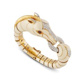 in oro giallo 18kt, realizzato a forma di zebra, decorato in smalto, impreziosito da diamanti taglio brillante per ct 2.80 circa, due rubini taglio rotondo per ct 0.70 circa, firmato "Tresor", punzoni 750 e 18kt, diam. interno cm 5,5 circa, circonferenza interna cm 16,5 cm, gr. 144