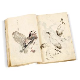 Le illustrazioni mostrano figure mitologiche o personaggi storici stilizzati, dipinti con tratti semplici ma espressivi, una caratteristica tipica dell'arte giapponese di quel periodo. Alcune pagine raffigurano uccelli dettagliatamente disegnati, firmato Chikutō Nakabayashi.