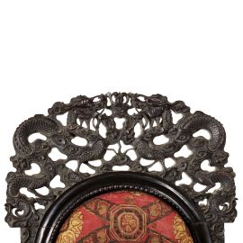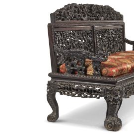 in legno duro, magnificamente intagliato, decorato con il motivo del Re Drago che dona un tesoro, insieme a motivi a dorso di drago. Ciascuna poltrona presenta uno schienale alto, elaboratamente intagliato con ornamenti che includono draghi e volute floreali, simboli di potere e raffinatezza. Il divano, in linea con lo stesso stile, ha uno schienale lungo che prosegue il tema intricato e simbolico, non solo come elemento d’arredo, ma anche come espressione culturale ed estetica della sua epoca.