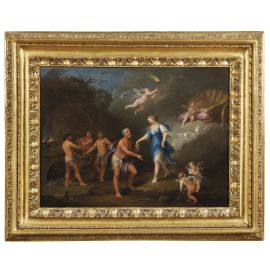 Inconsueto nella produzione di Francesco Zuccarelli in virtù del soggetto mitologico interpretato da raffinatissime figure, il bel dipinto qui offerto appartiene verosimilmente al fortunato periodo inglese dell’artista, durato ben un decennio a partire dal 1752. Prima di tornare a Venezia, egli organizzò a Londra presso Prestage e Hobbs una vendita delle sue opere, il 10 febbraio del 1762. In quel catalogo, ricco di ben settanta numeri, compare una serie di quattro scene mitologiche allusive alle Stagioni, tra cui appunto una scena con Venere e Vulcano, relativa all’Inverno e corrispondente alla nostra per dimensioni.