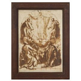 penna, inchiostro bruno e bistro su foglio riquadrato, mm 310x150