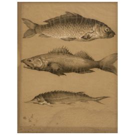 on the recto, lower left on the first sheet, pen and brown ink: "Pesci del Danubio stampati in Bologna da Leio dalla Volpe / 1 - Ciprinus Primo - 2 - Lucioperca - 3 - Hufo 6° Antacenis Rostratus"; lower left of the second sheet, pen and brown ink: "Pesci del Danubio -1 Astacus Primo -2- Testudo Lutania"; lower right, pen and brown ink: "Francesco Bali fece"