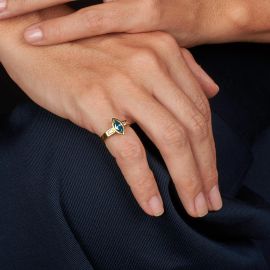in oro giallo 18kt, al centro un diamante con colore trattato di ct 0.50 circa, affiancato da due diamanti taglio tapes per ct 0.15 circa, punzoni 750 e del fabbricante, mis. 9/49, gr. 5