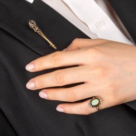 in oro e argento, anello impreziosito da opali taglio cabochon, mis. 5/45; spilla impreziosita da rose di diamante, dim. cm 5x1 circa, gr. 7 complessivi