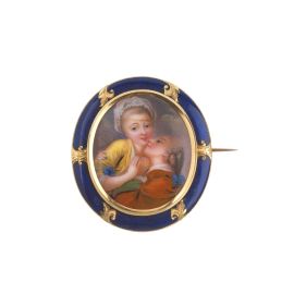 in argento, da cui pende un ciondolo con moneta, circondato da quattro diamanti taglio vecchio per ct 0.40 circa, diam. interno cm 7, dim. pendente cm 2,5x3,5, gr. 44; accompagnato da una spilla in oro 9kt, decorata in smalti policromi, con al centro una miniatura raffigurante una scena galante (difetti), dim. cm 3x3,5 circa, gr. 7