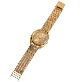 cassa tonneau placcata in oro con fondello in acciaio a vite, quadrante champagne, grafica nera, indici applicati, datario a ore tre, movimento a carica automatica cal A.S. 1902/03, bracciale non originale in oro giallo 18kt a maglia tessita con chiusura a scomparsa in oro giallo 18kt, vetro plastica, gr. 78. Dim. mm 34x40