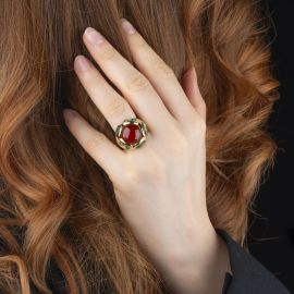 in oro giallo 18kt, impreziosito al centro da una corniola taglio cabochon circondata da calcedoni verdi, punzoni 750 e del fabbricante, mis. 16/56, gr. 13