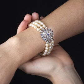realizzato a tre fili di perle di mm 6 circa, fermatura e distanziali in oro bianco 18kt impreziositi da zaffiri taglio rotondo per ct 0.50 circa, punzone 750, lungh. cm 17, gr. 37