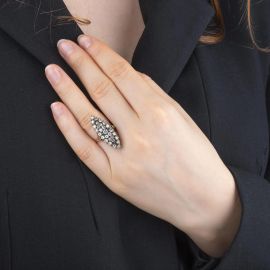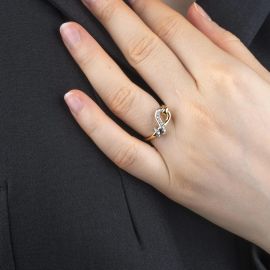 di cui uno in oro giallo e bianco 18kt, realizzato seguendo un motivo a fiocco, impreziosito da diamanti taglio huit huit per ct 0.10 circa, firmato "Damiani", punzone 750, mis. 12/52, gr. 4; accompagnato da un secondo anello a losanga in oro a basso titolo e argento, impreziosito da diamanti taglio rotondo per ct 1.40 circa, mis. 16/56, gr. 4