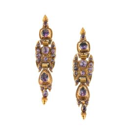 in oro 9kt, un paio impreziosito da ametiste sfaccettate, dim. cm 2x8, accompagnati da un secondo paio di orecchini, lungh. cm 5, gr. 24 circa complessivi