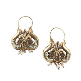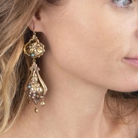 in oro 9kt, di cui un paio impreziositi da microperle e pasta di turchese, lungh. cm 9, accompagnati da un secondo paio di orecchini con piccole perle pendenti, chiusura a monachella, dim. cm 3x4, gr. 26 complessivi