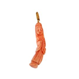 realizzata ad un filo di boules in corallo di mm 5 circa, fermatura in oro giallo 18kt, punzone 750, lungh. cm 98, accompagnata da un pendente in corallo inciso raffiguarnte una donna orientale, gr. 44 complessivi