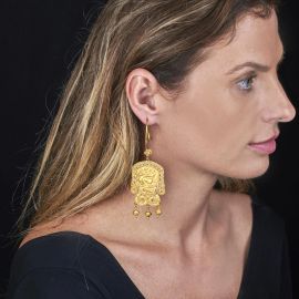 in lamina d'oro 24kt, con al centro scene figurate cinte da motivi circolari e a volute a rilievo, da cui pendono piccoli ciondoli, lungh. cm 9, gr. 32 complessivi