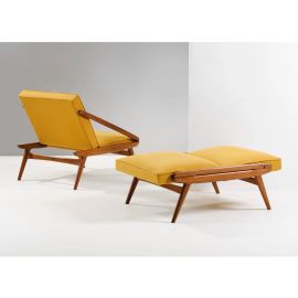 A PAIR OF FOLDING ARMCHAIRS, WOODEN STRUCTURE, YELLOW FABRIC UPHOLSTERY