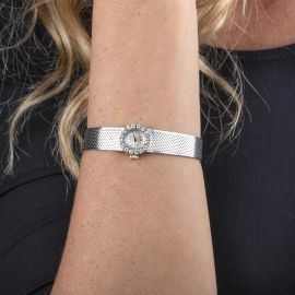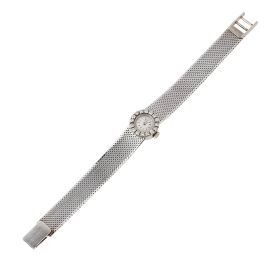 cassa in oro bianco 18kt, fondello a pressione, lunetta impreziosita da una fila di brillanti, quadrante argentè, indici applicati, movimento a carica manuale, bracciale integrato in oro bianco a maglia tessita con chiusura a scomparsa, vetro minerale, gr. 34. Corredato di scatola.